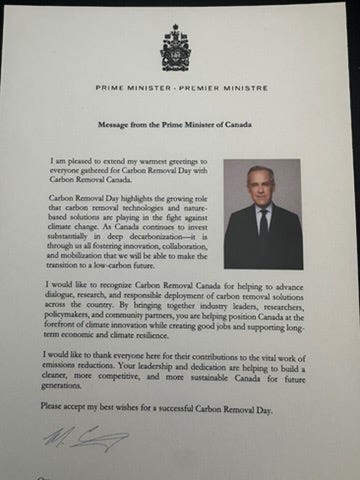 Even PM Carney shared a message of support, below. He might not have the political space to feature carbon removal as a top national priority at the moment, but it is encouraging to know there is support from the top on the policy framework that Canada is advancing to support removals innovation, commercialization, and standardization.